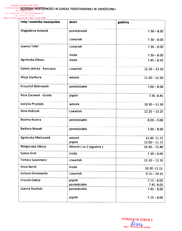 Harmonogram dostepności nauczycieli SPzOP w Zwróconej
