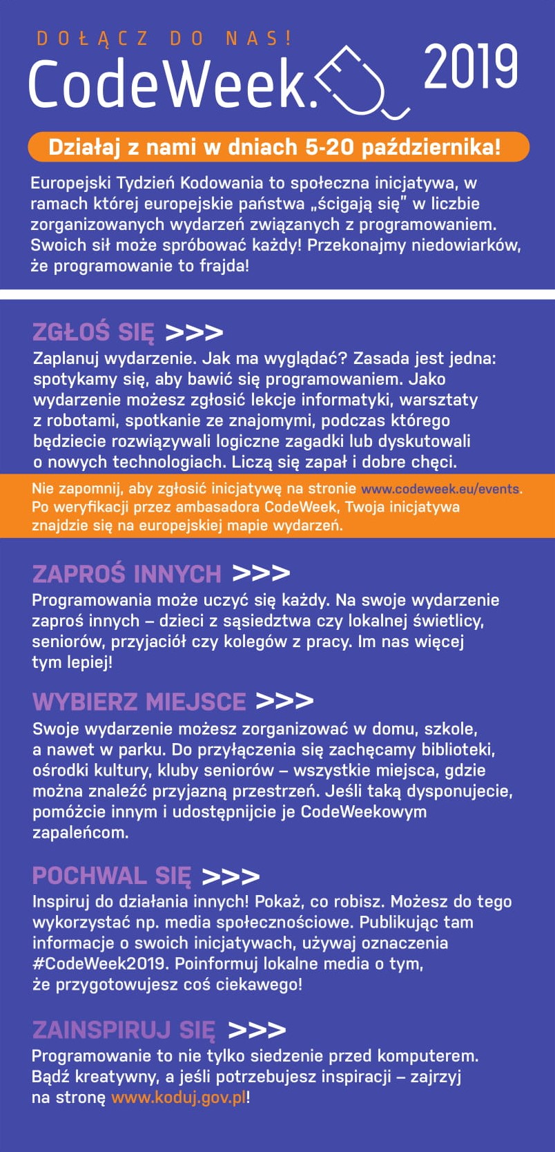 wydarzenie społeczne, w które angażują się wszystkie europejskie państwa i nie tylko! Jego misją jest poszerzanie i promowanie kompetencji z zakresu programowania i zachęcanie osób w każdym wieku do rozpoczęcia przygody z programowaniem. W skrócie: jeśli wiesz co nieco o programowaniu – w trakcie CodeWeek dowiesz się jeszcze więcej, jeśli o programowaniu nie wiesz nic – CodeWeek to świetna okazja, by zacząć swoją przygodę z kodami i robotami. Zapewniamy – to prostsze, niż Wam się wydaje! Dlatego do wspólnej zabawy zapraszamy osoby w każdym wieku – od maluchów z przedszkoli, po członków klubów seniora. Dajemy słowo – wszyscy będziecie bawić się świetnie.