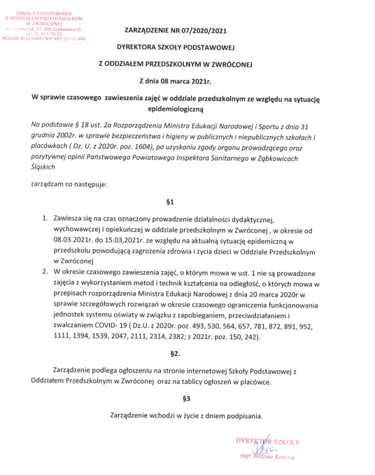 Zarządzenie dyrektora w sprawie czasowego zawieszenia zajęć