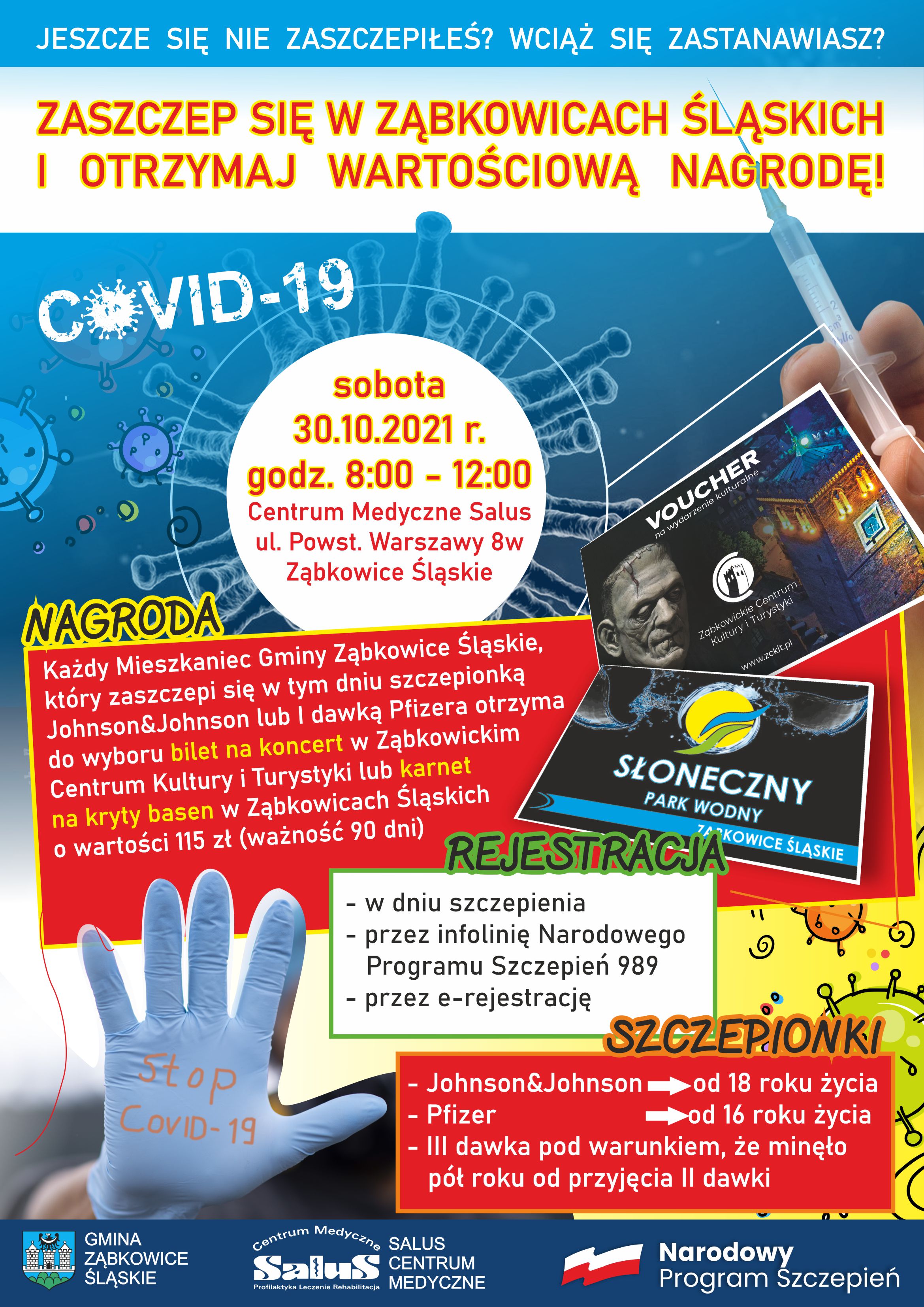 Zapraszamy na szczepienia przeciwko Covid-19 - każdy Mieszkaniec Gminy Ząbkowice Śląskie, który zaszczepi się w sobotę 30 października 2021 r. w CM Salus w Ząbkowicach Śląskich otrzyma do wyboru karnet na kryty basen w Ząbkowicach Śląskich lub bilet na wydarzenie kulturalne.
