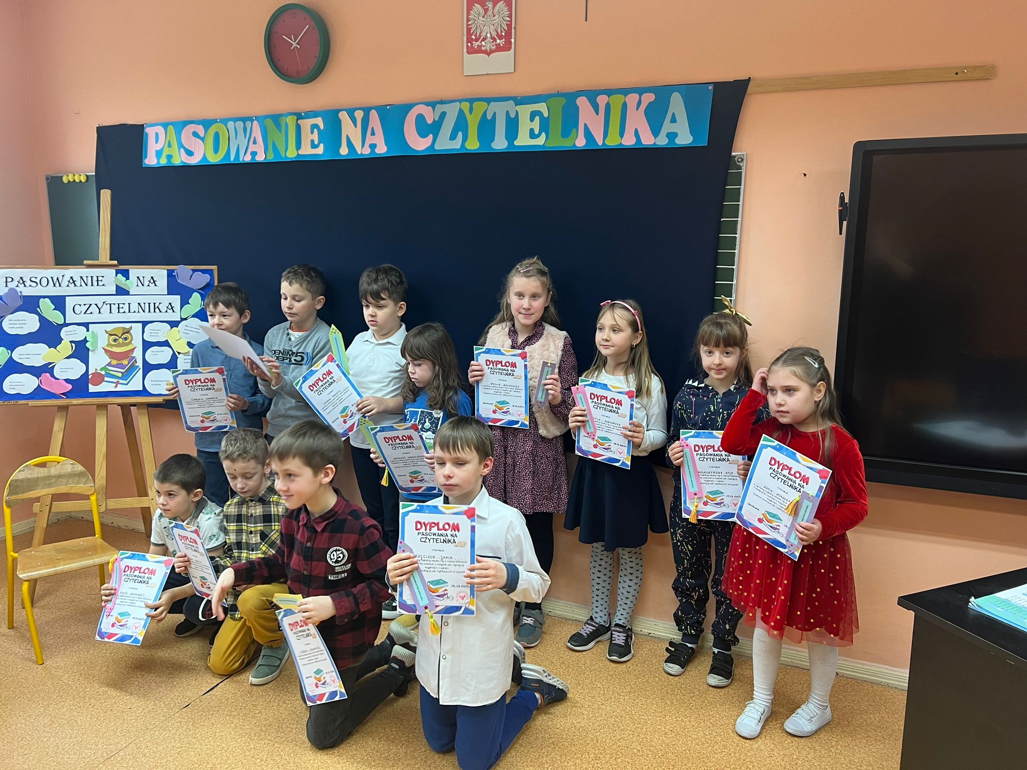 pt.” W krainie książek ”. Uczniowie dowiedzieli się, jak należy dbać o książki a czego nie wolno robić czytając je. Po takim wprowadzeniu przyszli czytelnicy złożyli uroczyste przyrzeczenie, obiecując zawsze szanować książki, a pani bibliotekarka dokonała pasowania. Pierwszaków nagrodzono również pamiątkowymi dyplomami oraz zakładkami do książek, które będą im przypominały o tym uroczystym wydarzeniu.
