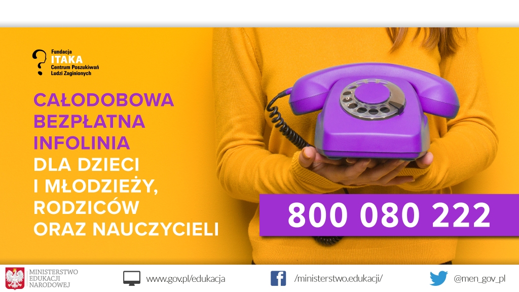 Już od dziś, 1 października 2019 r. działa nowa całodobowa, bezpłatna, ogólnopolska infolinia dla dzieci, młodzieży i ich opiekunów. Pod numerem telefonu 800 080 222 dzieci, młodzież, ale także rodzice, nauczyciele i pedagodzy będą mogli uzyskać profesjonalną pomoc doświadczonych psychologów, pedagogów i prawników.